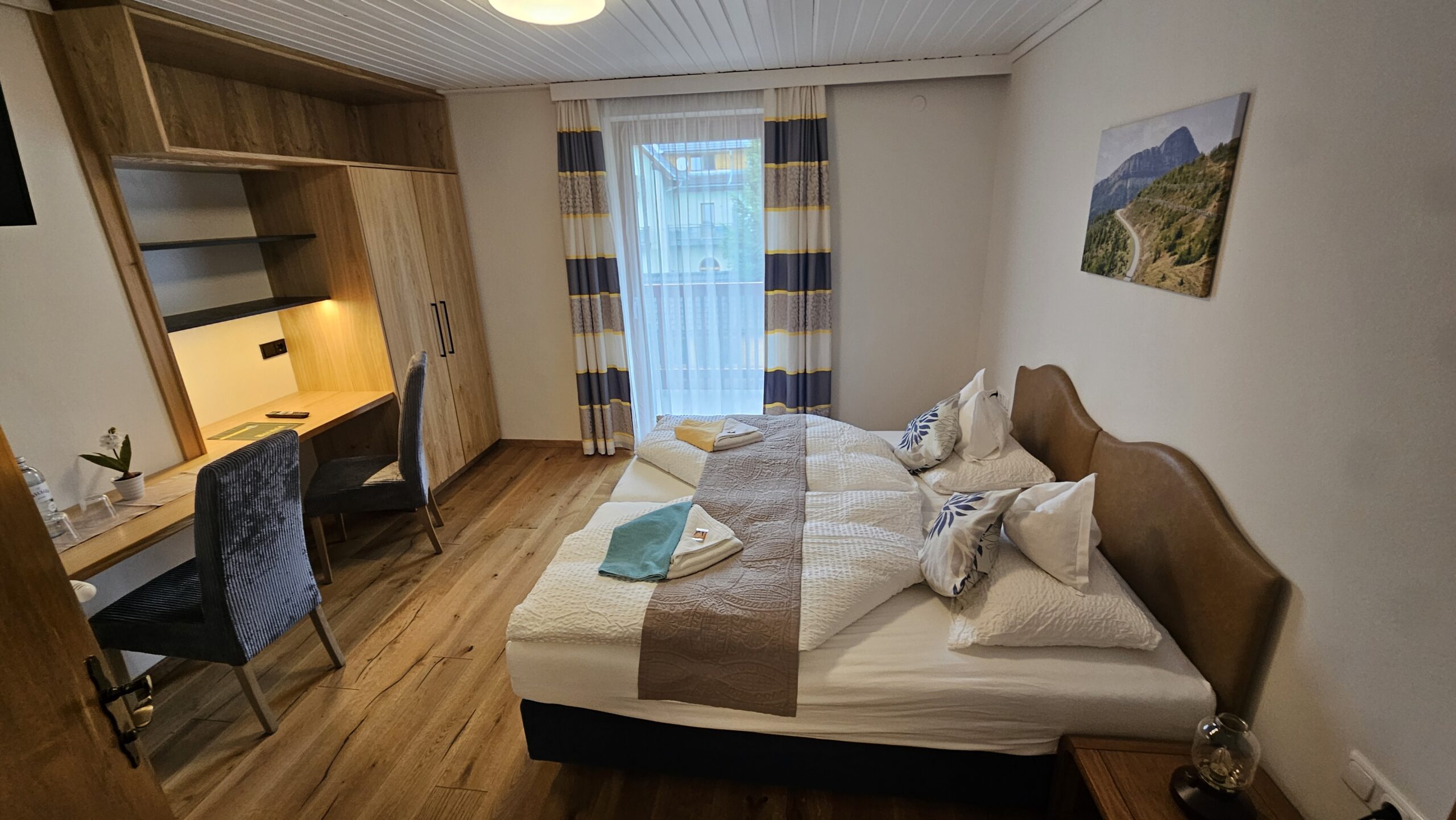 Blick in das Dopplezimmer mit Blick durch das große Fenster nach Süden